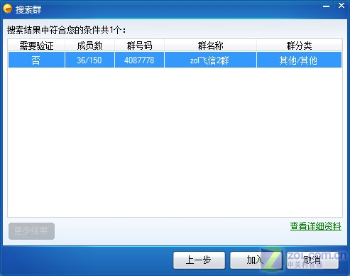如果你搜索的群已經(jīng)存在,那么程序?qū)谐鏊阉鞯饺禾,選中后單擊“加入”即可(如圖11)。