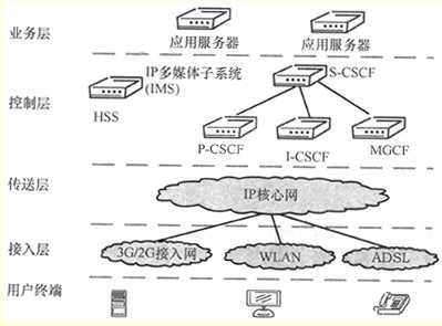 IMS使用會話發(fā)起協(xié)議(SIP)作為建立、控制、修改和終止兩個或者更多個參與者之間的語音、視頻和消息等會話的信令協(xié)議。在IMS中,與SIP相關(guān)的信令點稱為呼叫狀態(tài)控制功能信令點,并且根據(jù)它們功能的不同而有所區(qū)分。IMS中與鑒權(quán)、授權(quán)、計費相關(guān)的功能基于IETF、Diameter協(xié)議,是在HSS、CSCF等IMS組件上實現(xiàn)的,提供業(yè)務(wù)收費功能。HSS是與用戶和服務(wù)相關(guān)的數(shù)據(jù)的主要存儲器,由2G移動通信網(wǎng)的HLR演進而來。業(yè)務(wù)層上的應(yīng)用服務(wù)器提供各種業(yè)務(wù)邏輯,實現(xiàn)多種電信增值業(yè)務(wù)。傳送層的IP核心網(wǎng)是IMS業(yè)務(wù)的統(tǒng)一承載網(wǎng)絡(luò)。接入層提供包括2G、3G(UMTS、cdma2000)、WLAN、ADSL等在內(nèi)的多種接入方式。