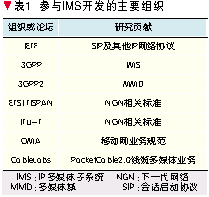 3GPP采用和其他標(biāo)準(zhǔn)化組織密切合作的方式制訂IMS技術(shù)標(biāo)準(zhǔn),并依靠各國通信界的協(xié)同不斷發(fā)展和完善(如表1所示)。其中,最重要的合作就是和IETF聯(lián)合開發(fā)了IMS網(wǎng)絡(luò)的核心控制協(xié)議SIP[1],共同研究SIP的擴展和應(yīng)用。另一個重要的合作是和Parlay組織聯(lián)合開發(fā)了支持開放式業(yè)務(wù)提供的Parlay/開放業(yè)務(wù)接入(OSA)應(yīng)用程序接口(API),將源于固定智能網(wǎng)結(jié)構(gòu)開放的Parlay技術(shù)引入IMS網(wǎng)絡(luò)的OSA結(jié)構(gòu)[2]。最重要的協(xié)同就是ETSI的TISPAN研究組和ITU-T提出了IMS中融入固定接入的技術(shù)[3],另一個重要的協(xié)同是OMA組織提出了許多基于IMS實現(xiàn)的業(yè)務(wù)規(guī)范和技術(shù)[4]。