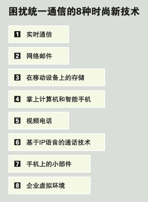 統(tǒng)一通信無疑是當(dāng)前最“時(shí)尚”的新技術(shù)之一,但是就在人們對這項(xiàng)技術(shù)廣泛關(guān)注的同時(shí),對它在穩(wěn)定性、安全性上的“微詞”也與日俱增。這次調(diào)查也不例外,在調(diào)查報(bào)告中,統(tǒng)一通信技術(shù)中涉及到的多項(xiàng)互聯(lián)網(wǎng)和通信新技術(shù)榜上有名。這些新技術(shù)在被調(diào)查者中被廣泛地應(yīng)用。但I(xiàn)T和網(wǎng)絡(luò)專家認(rèn)為,在企業(yè)很大面積地使用這些技術(shù),將會帶來一系列的安全威脅。