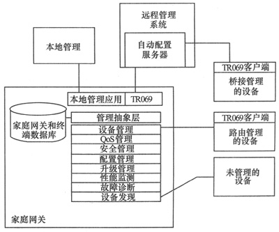 HGI規(guī)定的技術實現(xiàn)方式特點是,在架構和遠程管理協(xié)議方面全面采用DSL Forum技術體制,同時對家庭網關的功能進行了額外的規(guī)定,增加了本地管理的使用場景,并定義該接口在本地采用HTTP+HTML方式,遠程采用DSL Forum規(guī)定的方式(如圖4所示)。