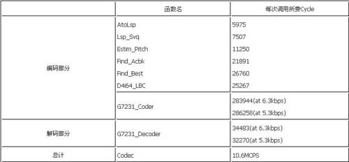 經(jīng)過C語言級和匯編級的多種優(yōu)化,最后實(shí)現(xiàn)了一路G.723.1的編解碼需要花費(fèi)10.6MCPS,整個(gè)代碼的程序空間為208K byte(程序中包括了部分c6201的庫函數(shù)),數(shù)據(jù)空間為8K byte,碼本大小20k byte,多通道的上下文數(shù)據(jù)為1.48K byte。200MHz的C6201每秒可以實(shí)時(shí)編解碼16路語音信號(hào)。所有代碼全部通過了ITU-T測試矢量的測試。表1是各主要模塊的運(yùn)算量。