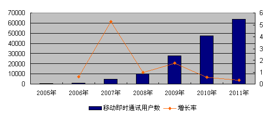 中國(guó)移動(dòng)即時(shí)通訊用戶規(guī)模發(fā)展?fàn)顩r(2005-2011)