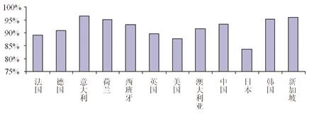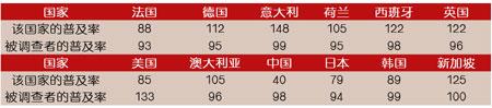 由于本次調(diào)查是在互聯(lián)網(wǎng)上進行的,因此被調(diào)查者大多是新興技術(shù)的最先使用者,這使得被調(diào)查者出現(xiàn)了一定的群體特征:大多數(shù)人擁有手機。例如,盡管中國目前大約40%的移動電話普及率低于西方一些國家,但是接受調(diào)查的中國用戶的移動電話飽有量高達98%,這一比例甚至超過西方一些國家。各個國家的移動電話普及率以及被調(diào)查者的移動電話擁有率情況見表1所示。