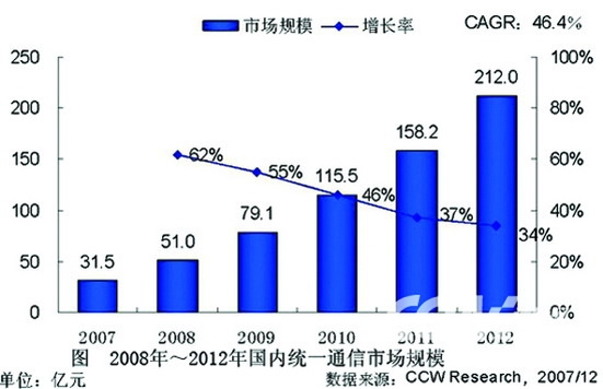 國內(nèi)外市場分析機(jī)構(gòu)先后推出關(guān)于統(tǒng)一通信的調(diào)查報(bào)告和分析預(yù)測(cè): 計(jì)世資訊今年6月發(fā)布的最新報(bào)告顯示,2008年國內(nèi)統(tǒng)一通信的市場規(guī)模將達(dá)到51億元人民幣,而從2008年到2012年,在未來五年的時(shí)間里,國內(nèi)統(tǒng)一通信市場將保持較快的增長趨勢(shì),年復(fù)合增長率將達(dá)到46.4%,截至2012年,國內(nèi)統(tǒng)一通信市場的規(guī)模將達(dá)到212億元人民幣。