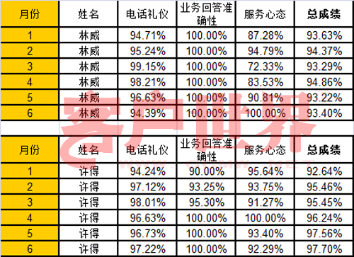 上面這兩張表格,是兩位員工的質(zhì)檢分?jǐn)?shù),從今年一月份開始,一月到六月每個(gè)月的質(zhì)檢分?jǐn)?shù),你看到有總分,還有三個(gè)分項(xiàng)的成績。請(qǐng)問,林威是新員工,還是許得是新員工?我們下一期公布答案。