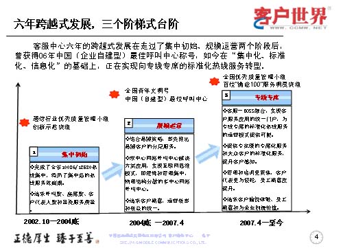 三個(gè)階段可以分為集中初始的02年10月到04年,規(guī)模運(yùn)營(yíng)是04年底到07年的4月,那么07年4月至今已經(jīng)是專線專席運(yùn)營(yíng)。我們的重點(diǎn)是在規(guī)模運(yùn)營(yíng)和專線專席上有所突破,規(guī)模運(yùn)營(yíng)主要是結(jié)合品牌策略,率先推出的是品牌客戶分層服務(wù);雙中心網(wǎng)絡(luò)呼叫中心解決方案應(yīng)用,實(shí)現(xiàn)互聯(lián)網(wǎng)思維模式及邏輯管理集中,物理結(jié)構(gòu)分散的多中心網(wǎng)絡(luò)呼叫中心;追求客戶滿意,運(yùn)營(yíng)效率和效益的統(tǒng)一。07年開始,我們重點(diǎn)實(shí)現(xiàn)客服系統(tǒng)與業(yè)務(wù)BOSS系統(tǒng)的全面融合,實(shí)現(xiàn)客戶服務(wù)應(yīng)用的統(tǒng)一門戶。也就是說(shuō),無(wú)論是我們的電話服務(wù)、營(yíng)業(yè)廳的服務(wù),還是客戶經(jīng)理的上門服務(wù),都應(yīng)用于客戶服務(wù)的統(tǒng)一門戶,實(shí)現(xiàn)著CRM的客戶關(guān)系管理。對(duì)于電話服務(wù)來(lái)講,我們以標(biāo)準(zhǔn)化、專業(yè)化的熱線服務(wù)運(yùn)營(yíng)模式,提升專家級(jí)的精細(xì)化服務(wù)和大眾客戶的標(biāo)準(zhǔn)化服務(wù),使得管理和培訓(xùn)更聚焦,客戶代表更為輕松,同時(shí)也提高了員工滿意度,實(shí)現(xiàn)了追求客戶愉悅體驗(yàn)、員工滿意和為企業(yè)創(chuàng)造價(jià)值。