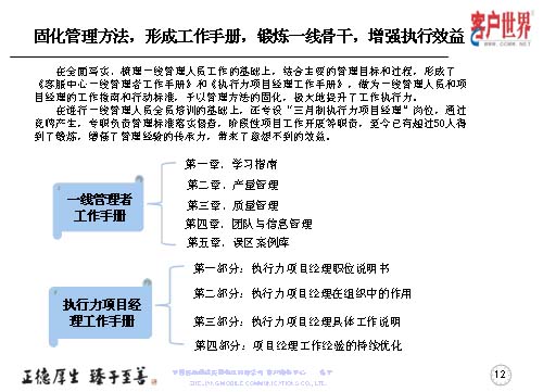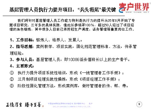 大家知道基層管理人員其實(shí)是兵頭將尾的最關(guān)鍵,我們將對(duì)基層管理人員的工作能力,特別是執(zhí)行力的提升是從05年8月份就開始了專項(xiàng)研究,三年多的具體實(shí)踐,值班長(zhǎng)的培訓(xùn)率達(dá)到100%,超過(guò)50人經(jīng)過(guò)了項(xiàng)目經(jīng)理的角色鍛煉,目前很多擔(dān)任過(guò)項(xiàng)目經(jīng)理的已經(jīng)承擔(dān)了生產(chǎn)調(diào)度、話務(wù)管理等重要的管理崗位。在這個(gè)項(xiàng)目當(dāng)中,我們從四個(gè)方面入手,工作目標(biāo)是鍛煉人、培養(yǎng)人、發(fā)展人。指導(dǎo)思想是案例教育、項(xiàng)目實(shí)踐,固化規(guī)范管理標(biāo)準(zhǔn)、方法,傳承管理經(jīng)驗(yàn)。參與人員就是基層管理人員,話務(wù)值班長(zhǎng)以上的生產(chǎn)骨干。我們主要運(yùn)用的形式是執(zhí)行力提升項(xiàng)目系統(tǒng)培訓(xùn),形成了《一線管理者工作手冊(cè)》。三月制項(xiàng)目經(jīng)理的實(shí)踐操練,通過(guò)競(jìng)聘的方式產(chǎn)生,形成了《項(xiàng)目經(jīng)理工作手冊(cè)》。階段性的固化-優(yōu)化-再固化的管理方法,形成案例庫(kù),做好管理者的傳幫帶。