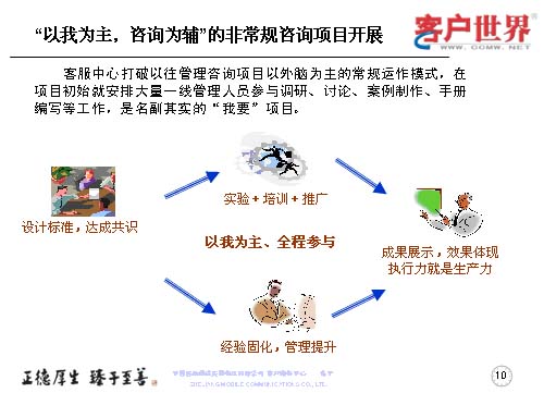 這個(gè)管理咨詢項(xiàng)目開展中,是以我為主,咨詢?yōu)檩o的非常規(guī)咨詢項(xiàng)目,打破的是以外腦為主的常規(guī)運(yùn)作模式,在項(xiàng)目初期就有大量的一線管理人員參與調(diào)研、討論、案例制作、手冊(cè)編制,是名副其實(shí)的“我要”項(xiàng)目。那么在這個(gè)方面我們分成了三部曲,設(shè)計(jì)標(biāo)準(zhǔn)、達(dá)成共識(shí),通過(guò)實(shí)驗(yàn)加培訓(xùn)推廣,以我為主的全程參與,來(lái)固化經(jīng)驗(yàn),提升管理。最后成果展示,效果體現(xiàn)于執(zhí)行力,彰顯出生產(chǎn)力。