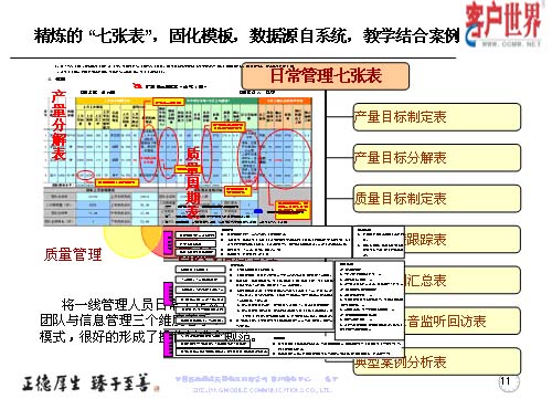 我們精煉了這么七張表的方式,運(yùn)用三個(gè)維度:產(chǎn)量管理、質(zhì)量管理和團(tuán)隊(duì)與信息管理,而這些基礎(chǔ)數(shù)據(jù)都來(lái)自于系統(tǒng),教學(xué)和案例。而七張表是從產(chǎn)量、質(zhì)量和團(tuán)隊(duì)信息來(lái)展現(xiàn)出具體的一些應(yīng)用,將一線管理人員從日常工作的三個(gè)維度入手,形成七張表管理模式,很好地具備了操作標(biāo)準(zhǔn)和規(guī)范。這模板表除了系統(tǒng)出來(lái)的一些數(shù)據(jù)以外,通過(guò)我們基層管理人員的項(xiàng)目執(zhí)行和跟蹤檢查,形成一些案例,改進(jìn)計(jì)劃和改進(jìn)意見。這幾張表多為系統(tǒng)自身所產(chǎn)生一些具體的數(shù)據(jù),比如說(shuō)上個(gè)月的指標(biāo)值如何設(shè)定,實(shí)際達(dá)成的產(chǎn)量怎樣,回訪滿意率具體有哪些數(shù)據(jù),都在客服系統(tǒng)的報(bào)表中提煉出來(lái)的相關(guān)數(shù)據(jù)。
