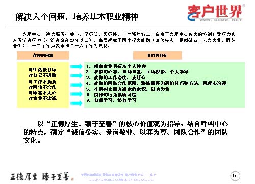 一線客服人員如何來(lái)全面提升職業(yè)能力,首先是解決一線客服人員的六個(gè)問(wèn)題,剛才已經(jīng)跟大家交流了客服中心一線人員的人員結(jié)構(gòu),當(dāng)前的六個(gè)主要問(wèn)題可以用簡(jiǎn)單的幾個(gè)方面來(lái)表述:對(duì)生活沒(méi)有明確的目標(biāo)、對(duì)自己不進(jìn)取、對(duì)工作不負(fù)責(zé)、對(duì)同事不合作、對(duì)顧客不關(guān)心、對(duì)企業(yè)不忠誠(chéng),這是在日常工作中,一線人員所存在的問(wèn)題。而針對(duì)這些問(wèn)題,我們要用工作目標(biāo)去持續(xù)解決和克服問(wèn)題,所以我們采取的是讓大家明確企業(yè)目標(biāo)與個(gè)人使命,用積極的心態(tài)自主自發(fā),主動(dòng)積極和個(gè)人領(lǐng)導(dǎo);良好的工作態(tài)度責(zé)任心,良好的團(tuán)隊(duì)合作氛圍;熟練掌握溝通技巧和方法,牢固樹立顧客滿意的意識(shí),以客為尊;良好的行為素質(zhì)習(xí)慣,自我學(xué)習(xí),終身學(xué)習(xí)。從而在中國(guó)移動(dòng)集團(tuán)“正德厚生、臻于至善”的核心價(jià)值觀指導(dǎo)下,結(jié)合呼叫中心特點(diǎn),確定誠(chéng)實(shí)務(wù)信,愛崗敬業(yè),以客為尊、團(tuán)隊(duì)合作的團(tuán)隊(duì)文化。