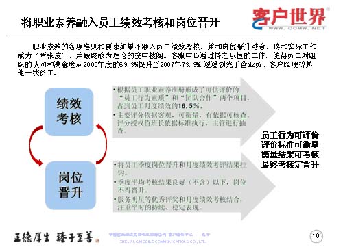 職業(yè)素養(yǎng)不是說(shuō)在嘴上,講在課上,而是更多地融入到員工的績(jī)效考核于崗位晉升當(dāng)中。以解決工作素養(yǎng)要求和實(shí)際工作的兩張皮,以及使得客服理念成為理論的空中樓閣。所以我們是持之以恒地開展一線員工組織認(rèn)同滿意度調(diào)查,我們每年都會(huì)做一線客服人員的滿意度調(diào)查,在滿意度調(diào)查當(dāng)中,從05年的69.3%,提升到07年的73.9%,而且遙遙領(lǐng)先于營(yíng)業(yè)員和客服經(jīng)理。而在績(jī)效考核中主要把員工行為素質(zhì)、團(tuán)隊(duì)合作占到了員工月度績(jī)效的16.5%,使大家認(rèn)識(shí)到作為一個(gè)組織中的一員,作為團(tuán)隊(duì)我們是為了一個(gè)共同的目標(biāo),彼此依賴、彼此信任,同時(shí)也要強(qiáng)化績(jī)效來(lái)管理。所以主要的評(píng)分依據(jù)是客觀、可衡量、有依據(jù)可查,同時(shí)也把這些也作為客服人員季度晉升和月度績(jī)效考評(píng)掛鉤,如果該員工季度的平均考核在良好以下的話,將得不到晉升,最終實(shí)現(xiàn)的是員工行為可評(píng)價(jià),評(píng)價(jià)標(biāo)準(zhǔn)可衡量,衡量結(jié)果可考核,最終考核定晉升。