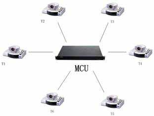 在會(huì)議場(chǎng)點(diǎn)數(shù)目不多且地域分布比較集中時(shí),可采用單MCU方式,其組網(wǎng)結(jié)構(gòu)見(jiàn)圖所示。圖中T1-T6均為視頻會(huì)議終端系統(tǒng)設(shè)備。