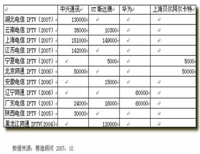 在IPTV設(shè)備供應(yīng)商中,各家廠商各有千秋,其中在國(guó)內(nèi)市場(chǎng)占有率最好的是中興通訊,其次是UT斯達(dá)康、華為、上海貝爾阿爾卡特。中興通訊跟華為均能提供端到端的解決方案,從頭端到客戶端,從業(yè)務(wù)層到傳輸層,提供完整的設(shè)備,可以使用統(tǒng)一的平臺(tái)對(duì)整個(gè)系統(tǒng)進(jìn)行管理,并且在保證統(tǒng)一的同還提供了較好的開放性,支持多家內(nèi)容提供商及STB的接入。