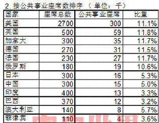 美國(guó)擁有全世界最多的座席,達(dá)到270萬個(gè),公共事業(yè)座席30萬個(gè),占11.1%;除美國(guó)以外,公共事業(yè)類座席總數(shù)排名在第2~6名的依次是:英國(guó),加拿大,德國(guó),法國(guó),俄羅斯。