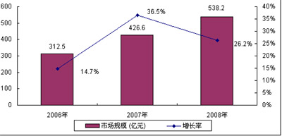 圖3 2006-2008年中國(guó)通信設(shè)備市場(chǎng)規(guī)模及增長(zhǎng)