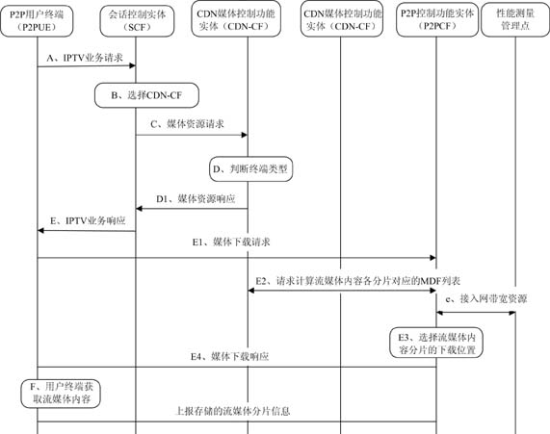 - 獲得相關信息后,P2PCF根據(jù)接入網(wǎng)資源占用情況、從CDN-CF獲取的CDN-MF列表、存儲相關資源的P2P終端狀態(tài),生成供P2PUE下載節(jié)目片段的列表。