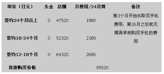 我們都知道日本的購(gòu)買(mǎi)手機(jī)最主要是和運(yùn)營(yíng)商簽約購(gòu)買(mǎi),我們以夏普2009年夏季最新款手機(jī)Soft Bank 933SH為例,來(lái)說(shuō)明一下在日本購(gòu)買(mǎi)手機(jī)的成本?偟膩(lái)說(shuō),就是簽約時(shí)間越長(zhǎng),購(gòu)買(mǎi)手機(jī)價(jià)格越低,簽約時(shí)間越短,購(gòu)買(mǎi)價(jià)格越高。