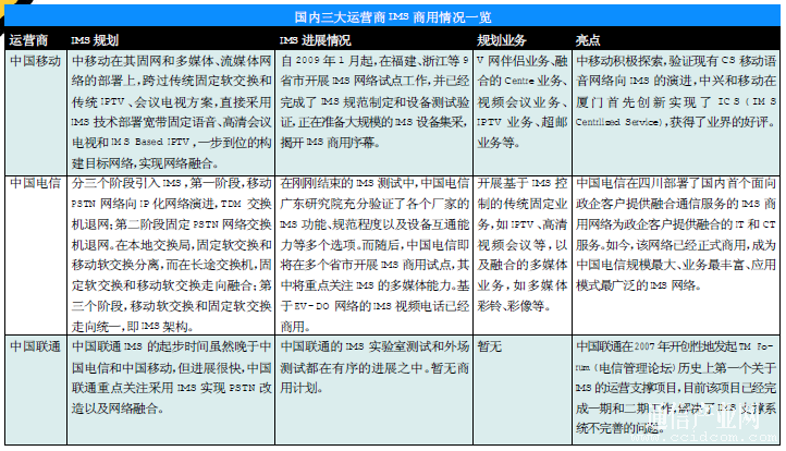 國(guó)內(nèi)三大運(yùn)營(yíng)商已經(jīng)開始積極試點(diǎn)和部署IMS商用網(wǎng)絡(luò),樹立全業(yè)務(wù)競(jìng)爭(zhēng)市場(chǎng)的優(yōu)勢(shì)。