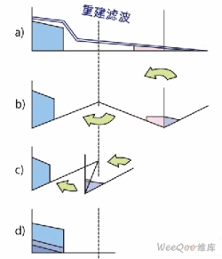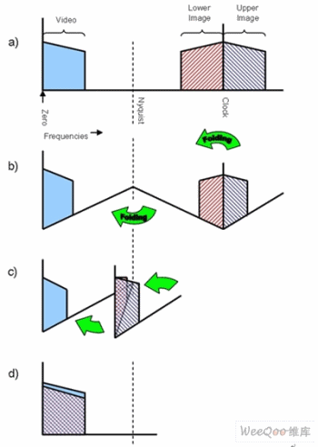 從圖5可以看出重建濾波器的作用,利用參考書中提供的定理可以很容易理解頻譜混疊。通常,在頻域,頻率和放大倍數都采用對數刻度,重建濾波器的頻響特性表現(xiàn)為平滑曲線。然而,為了說明邊帶重疊的位置,我們用線性坐標表示頻率和放大倍數。為了表示低通濾波器在同樣刻度坐標下的衰減特性,從濾波器頻響曲線可以看出:對于有用的視頻信號衰減很少,對于鏡像頻率衰減較大。圖5b和5c顯示了混疊效應,但是應該注意到,與圖3d相比,圖5d中的鏡像頻率被顯著衰減。
