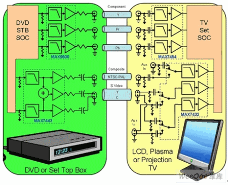 圖6左側是機頂盒或DVD機的框圖,片上系統(tǒng)(SOC)包含了DAC,輸出經過低通濾波器(例如MAX7443)進行視頻重建。濾波器芯片還包含75Ω同軸電纜驅動器,驅動信號在電纜上的傳輸。圖6右側用于信號接收,信號在經過抗混疊濾波器后送入電視機SOC的ADC。