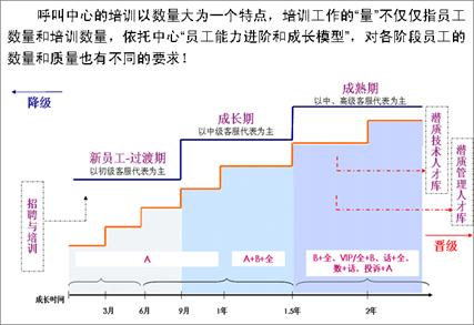 業(yè)務模塊化后,客服中心對一線客服代表進行分級認證,針對簡單業(yè)務和復雜業(yè)務分別設置首層和二線專席兩類共計8種人員承接梯隊,達到業(yè)務與人員的全匹配。人員梯隊的設置對人員的培訓管理和進出機制提出了新的挑戰(zhàn),如何科學界定不同隊列人員的技能標準?如何設置不同成長時期員工的進出管理機制?