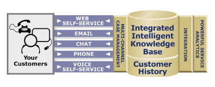 Technologies”是一家非常著名的多接觸點呼叫中心供應商,這家公司建議采用“通用事故”追蹤機制,它強調報表和歷史紀錄必須作為任何一個多接觸點聯(lián)絡中心不可或缺的組成部分!癛ightnow”提供的以下插圖很清楚地向我們展示了多渠道知識庫集成是如何被強制執(zhí)行的。