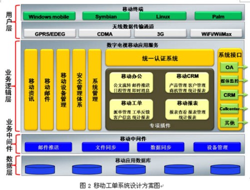 移動(dòng)工單系統(tǒng)是在Windows Mobile智能手機(jī)操作系統(tǒng)上自主研發(fā),采用B/S和C/S混合架構(gòu),以TCP/IP作為基礎(chǔ)數(shù)據(jù)傳輸協(xié)議,通過(guò)移動(dòng)通信網(wǎng)絡(luò)無(wú)線數(shù)據(jù)通道GPRS/EDGE/CDMA1x等,將呼叫中心的工單數(shù)據(jù)推送到智能手機(jī)上,由外勤服務(wù)人員將服務(wù)情況進(jìn)行實(shí)時(shí)的反饋。利用的同步中間件可將最新的資訊文件推送到手機(jī)終端上,服務(wù)人員無(wú)需登錄即可在終端可以查看最新的廣電資訊,可支持doc、xls、ppt等 Office文檔格式的瀏覽,支持WMV、WAV、3GP多種音視頻文件播放。服務(wù)人員可以不受地點(diǎn)和時(shí)間的限制通過(guò)終端實(shí)時(shí)獲取最新的多媒體客戶交互中心運(yùn)營(yíng)數(shù)據(jù)報(bào)表,圖2為系統(tǒng)設(shè)計(jì)方案圖。