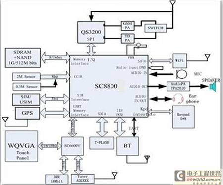 方案集成度高、設(shè)計簡潔:基于SC8800、QS3200和SC6600V的設(shè)計方案框圖如下圖,僅三顆主芯片就實現(xiàn)了TD-SCDMA多媒體功能手機電視方案,方案公司硬件設(shè)計方便。