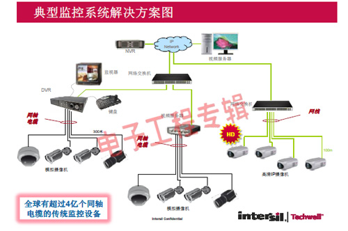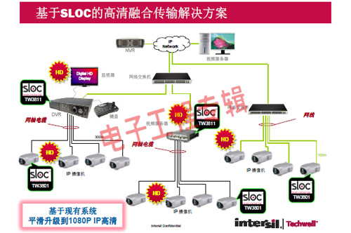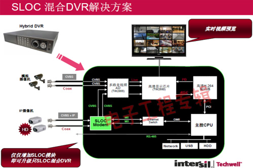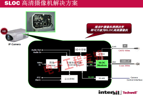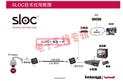 革命性的Intersil Techwell SLOCTM(Security Link over Coax)同軸電纜復(fù)合視頻傳輸解決方案是可通過一條同軸電纜同時(shí)傳輸模擬 CVBS 視頻和高清數(shù)字 IP 視頻信號的先進(jìn)調(diào)制解調(diào)器解決方案,其采用最新MODEM PHY技術(shù)的傳輸解決方案,可以基于同軸電纜同時(shí)傳輸高清IP碼流和標(biāo)清模擬實(shí)時(shí)視頻。