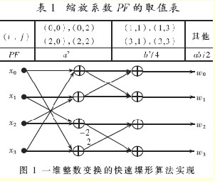 ·2q,PF稱為縮放系數(shù),根據(jù)元素在陣列塊中的不同位置,其取值如表1所示,Qstep為量化步長(zhǎng),由0至51共52個(gè)量化參數(shù)QP決定,QP增加1,Qstep增加12.5%;q=15+QP/6,QP/6取整數(shù);對(duì)于幀內(nèi)宏塊f取2q/3,幀間宏塊f取2q/6。需要指出的是,MF的值可根據(jù)PF和QP的取值經(jīng)簡(jiǎn)單計(jì)算得到,并可形成表格,通過查表方式便可實(shí)現(xiàn)硬件運(yùn)算,并有效地提高了運(yùn)算速度。