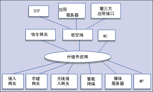 接入層包括各種接入網(wǎng)關(guān)、中繼網(wǎng)關(guān)、無線接入網(wǎng)關(guān)、智能終端以及與處理媒體有關(guān)的媒體服務(wù)器和多點處理器(MP)。傳送層包括提供IP包轉(zhuǎn)發(fā)的各種承載網(wǎng)功能實體?刂茖邮荖GN網(wǎng)絡(luò)的核心,主要包括軟交換設(shè)備、信令網(wǎng)關(guān)和多點處理器。業(yè)務(wù)層則主要包括應(yīng)用服務(wù)器、第三方應(yīng)用接口和傳統(tǒng)智能網(wǎng)功能。該業(yè)務(wù)層通過開放的業(yè)務(wù)層接口向用戶提供傳統(tǒng)智能網(wǎng)業(yè)務(wù)、多樣化的第三方業(yè)務(wù)和增值業(yè)務(wù)。