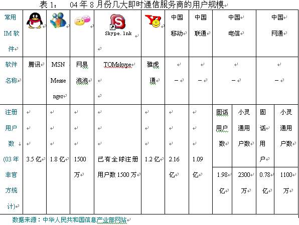 11月16日,TOM在線和歐洲行業(yè)巨頭Skype在京聯(lián)手推出聊天工具TOM-Skype,此業(yè)務(wù)的出現(xiàn),立即在即時(shí)通信市場(chǎng)上掀起了軒然大波。其清晰的話音質(zhì)量,簡(jiǎn)潔方便的操作界面,擁有來(lái)自165個(gè)國(guó)家1500多萬(wàn)的全球用戶,在極短的時(shí)間內(nèi)就吸引到了大量的中國(guó)用戶,更讓基礎(chǔ)運(yùn)營(yíng)商感到不安的是skype強(qiáng)大的語(yǔ)音聊天功能將可能大大改變傳統(tǒng)電信的使用習(xí)慣;而與此同時(shí),現(xiàn)有的QQ,POPO等國(guó)內(nèi)即時(shí)通信工具也早已開展了語(yǔ)音聊天功能,只是苦于目前話音質(zhì)量不盡理想而已。面對(duì)眾多虛擬運(yùn)營(yíng)商現(xiàn)實(shí)和潛在威脅,幾大基礎(chǔ)運(yùn)營(yíng)商選擇先下手為強(qiáng),進(jìn)入“即時(shí)通信”市場(chǎng)的戰(zhàn)略也就不足為怪了。