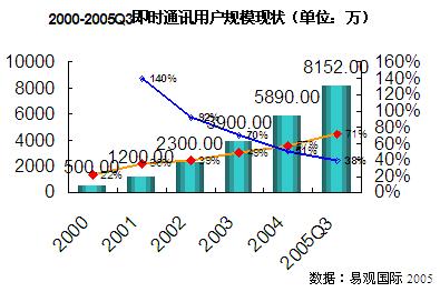 從1999年騰訊推出 OICQ 開始,短短幾年時間中,即時通信用戶數(shù)量迅速增長。在2000年至2004年期間,年增長率分別為140%、92%、70%和51%。根據(jù)易觀國際大樣本調(diào)研的結(jié)果,到2005第三季度中國即時通訊用戶數(shù)量增長到8,152萬,比去年增長38%。