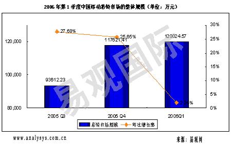 新華美通消息:易觀國際研究表明,2006年第一季度,CRBT 業(yè)務(wù)整體市場規(guī)模達(dá)到16億元,環(huán)比增長率為5%,增長速度較上個(gè)季度大幅度下降,業(yè)務(wù)已經(jīng)進(jìn)入低級(jí)飽和期。其中中國移動(dòng)的彩鈴業(yè)務(wù)的市場規(guī)模環(huán)比增長率僅僅為2%,如果扣除中國移動(dòng)和中央電視臺(tái)合作進(jìn)行的春晚彩鈴業(yè)務(wù)收入,中國移動(dòng)彩鈴業(yè)務(wù)市場規(guī)模實(shí)際略有下降。