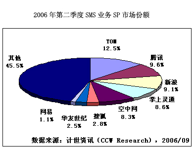 計世資訊(CCW Research)調(diào)研顯示。2006年第二季度,中國SMS業(yè)務(wù)市場規(guī)模達到118.3億元人民幣,其中SP收入12.1億元人民幣。TOM、騰訊和新浪排名前三位,分別占12.5%、9.6%和9.1%。其次為掌上靈通和空中網(wǎng),占8.6%和8.3%。