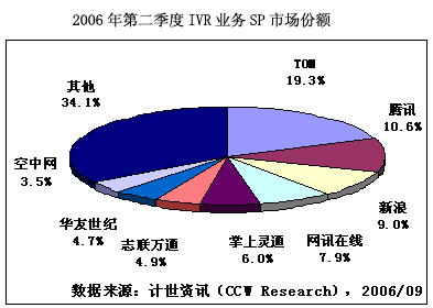 第二季度,移動IVR市場為6.5億元人民幣,SP收入4.9億元人民幣。TOM在線優(yōu)勢明顯,為19.3%。其次為騰訊、新浪和網(wǎng)訊在線通,分別為10.6%、9.0%和7.9%。隨著移動運營商對SP的規(guī)范,IVR市場將更加集中。
