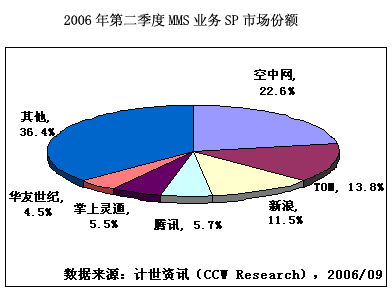 第二季度MMS業(yè)務(wù)市場規(guī)模4.4億元人民幣,SP收入2.3億元人民幣?罩芯W(wǎng)占22.6%市場份額,其次為TOM,市場份額為13.8%。