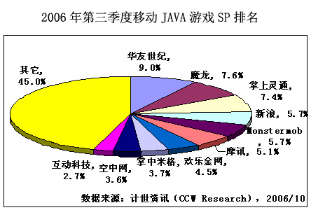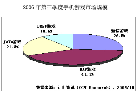計(jì)世資訊(CCW Research)數(shù)據(jù)顯示,2006年第三季度中國手機(jī)游戲市場(chǎng)規(guī)模達(dá)到6.7億元人民幣,比第二季度增長(zhǎng)11.9%。 手機(jī)游戲市場(chǎng)規(guī)模包括移動(dòng)運(yùn)營(yíng)商、手機(jī)游戲服務(wù)提供商在手機(jī)游戲業(yè)務(wù)上的總體收入,但不包括手機(jī)游戲軟件開發(fā)商的收入。第三季度,短信游戲增速繼續(xù)放緩,短信游戲市場(chǎng)規(guī)模達(dá)到1.8億元,占手機(jī)游戲市場(chǎng)份額的26.5%。WAP,JAVA和BREW游戲繼續(xù)保持快速增長(zhǎng),第三季度WAP、JAVA和BREW游戲市場(chǎng)規(guī)模分別為2.8億元、1.4億元和0.7億元。