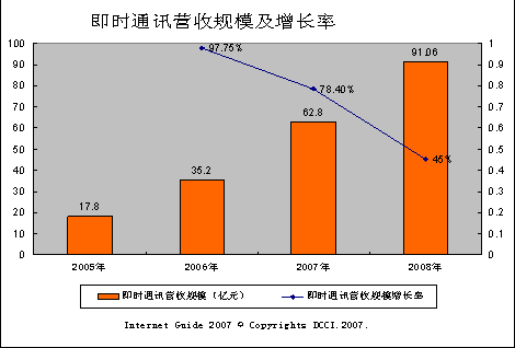 據(jù)DCCI預(yù)測(cè),我國(guó)IM服務(wù)營(yíng)收規(guī)模未來兩年仍有大幅度增長(zhǎng),2007年該市場(chǎng)將增長(zhǎng)78.4%,達(dá)到62.8億元人民幣,到2008年該市場(chǎng)將增至91.06億元人民幣。