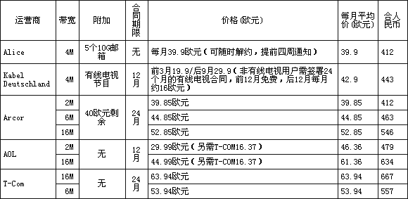 在純上網(wǎng)服務(wù)方面,德國(guó)Alice公司的4Mbps寬帶最為廉價(jià),包月30歐元,德國(guó)人一般月工資大約是1500~2500歐元,上網(wǎng)費(fèi)占低于純收入的2%。