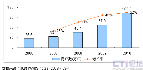 圖1 2008-2010年中國(guó)無線電郵業(yè)務(wù)用戶規(guī)模預(yù)測(cè)