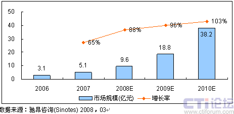 毫無疑問,3G將成為無線電郵市場(chǎng)最有利的推動(dòng)因素,3G的先進(jìn)技術(shù)和網(wǎng)絡(luò)將賦予無線電郵比普通單一短信更加豐富的應(yīng)用空間,它有望成為繼短信之后的又一個(gè)“殺手級(jí)”業(yè)務(wù)。預(yù)計(jì)未來三年,無線電郵市場(chǎng)將呈現(xiàn)爆發(fā)式的增長(zhǎng),市場(chǎng)規(guī)模將從2007年5.1億元上升到2010年的38.2億元。