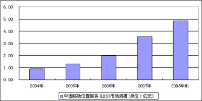 圖 1 2003-2008年上半年中國(guó)移動(dòng)位置服務(wù)(LBS)市場(chǎng)規(guī)模