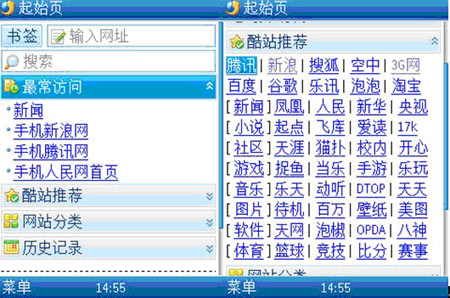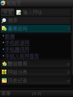 首先,起始頁非常簡潔,只有書簽、網(wǎng)址輸入框、搜索框、最常訪問、酷站推薦、網(wǎng)站分類、歷史紀錄幾個功能。在酷站推薦中,前幾位是騰訊、新浪、搜狐、空中、3G門戶、百度等常用網(wǎng)址。