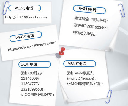 據(jù)“通話寶”官方網(wǎng)站(http://ctd.189works.com/)介紹,“通話寶”目前支持WEB、WAP、短信及QQ和MSN五種撥打網(wǎng)絡(luò)電話的方式。用戶除了使用WEB、WAP訪問網(wǎng)頁撥打電話外,還可以通過添加特定的QQ號碼或者M(jìn)SN聯(lián)系人實(shí)現(xiàn)帳號注冊、撥打電話等操作。