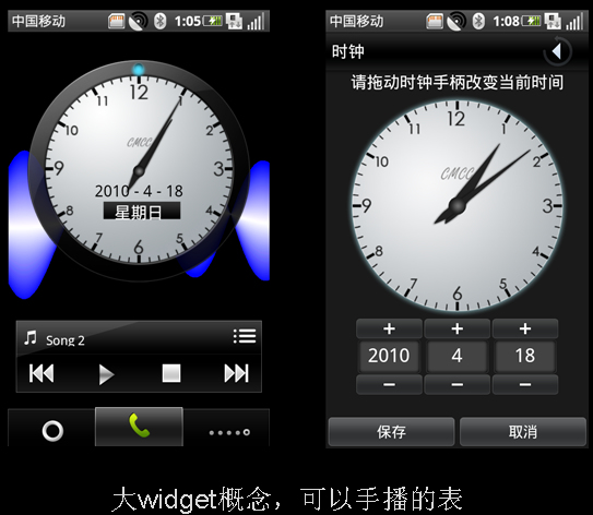 第三,引入大widget概念。Widget給用戶提供了簡易接口來執(zhí)行一些常用功能。OPhone2.0版本首次引入了大widget概念,將手機(jī)人性化操作提升到了新的高度。譬如,手機(jī)最簡單也是最常用的顯示時(shí)間功能,就在OPhone2.0中被設(shè)計(jì)成了一個(gè)“可以用手播動(dòng)的表”,用戶不必再繁瑣地輸入數(shù)字來修改時(shí)間。