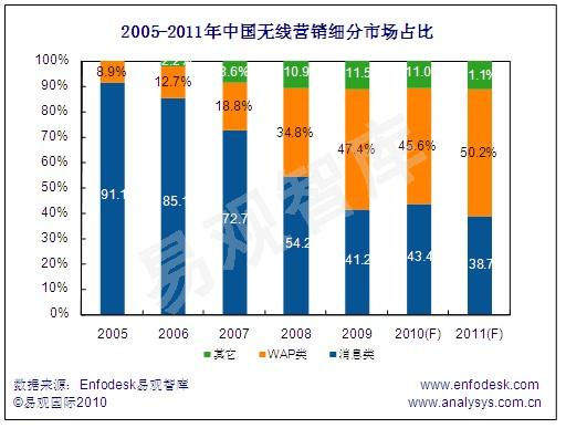 根據(jù)Enfodesk易觀(guān)智庫(kù)近期發(fā)布《中國(guó)無(wú)線(xiàn)營(yíng)銷(xiāo)市場(chǎng)專(zhuān)題報(bào)告2010》顯示, 2009年中國(guó)無(wú)線(xiàn)營(yíng)銷(xiāo)市場(chǎng)WAP類(lèi)廣告在無(wú)線(xiàn)營(yíng)銷(xiāo)整體占比達(dá)47.4%,其規(guī)模同比增長(zhǎng)76.8%,與消息類(lèi)廣告同比下跌1.3%相比WAP類(lèi)廣告,已成為無(wú)線(xiàn)營(yíng)銷(xiāo)市場(chǎng)最大推動(dòng)力量。