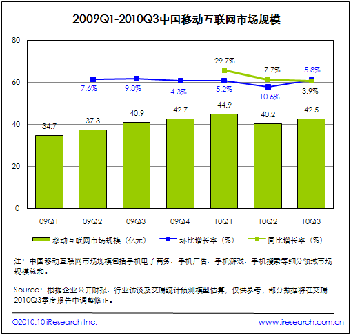 艾瑞:2010Q3中國移動(dòng)互聯(lián)網(wǎng)市場(chǎng)規(guī)模小幅增長(zhǎng)