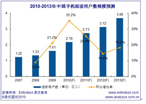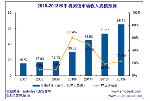 中國手機(jī)閱讀市場2010年在運(yùn)營商閱讀基地的推動下,收入規(guī)模相比2009年有快速的增長,增長幅度達(dá)60.4%。預(yù)計2013年中國手機(jī)閱讀市場銷售規(guī)模將達(dá)到65.31億元,活躍用戶達(dá)到3.69億人。
